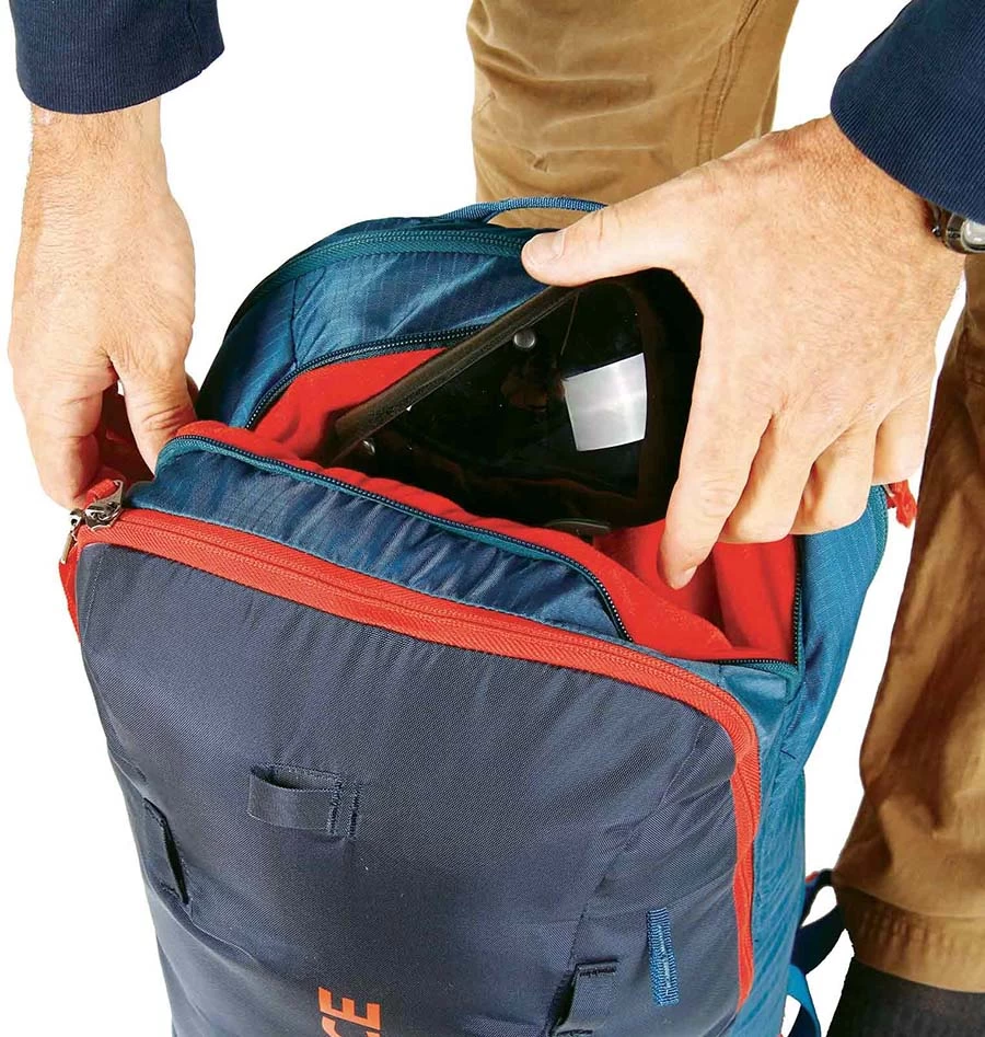 The rucksack’s main compartment allows plenty of room to load gear easily by using the large rear opening. Inside you will find a hydration reservoir pocket and drinking tube port. The lid features a zip pocket specially designed to keep your goggles safe and scratch-free.