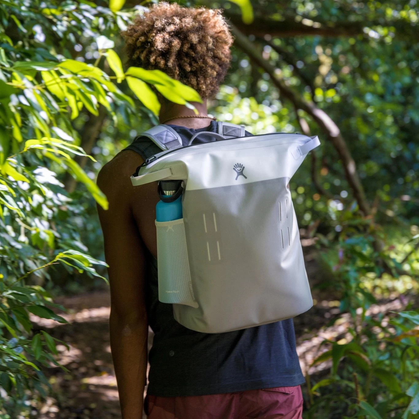 The trail-friendly design features a backpack-style carry with a padded mesh back panel and padded shoulder straps for practical and comfortable hands-free transport. This cool bag also features a woven sternum strap and lifter handles while laser-cut welded loops let you attach smaller accessories to the outside for carrying ease. A stretch mesh side pocket holds a 32oz Hydro Flask bottle to help keep you hydrated on the move (water bottle not included).