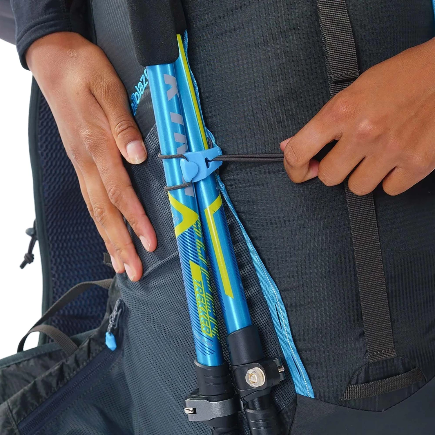 This pack has plenty of storage options with two security zipped pockets on the harness, wrap-around security zip wand pockets, and multiple pole attachment points alongside the main compartment. A fast-access bladder pocket ensures easy hydration too, and reflective details on the front daisy chain ensure you can travel safely even in the dark.