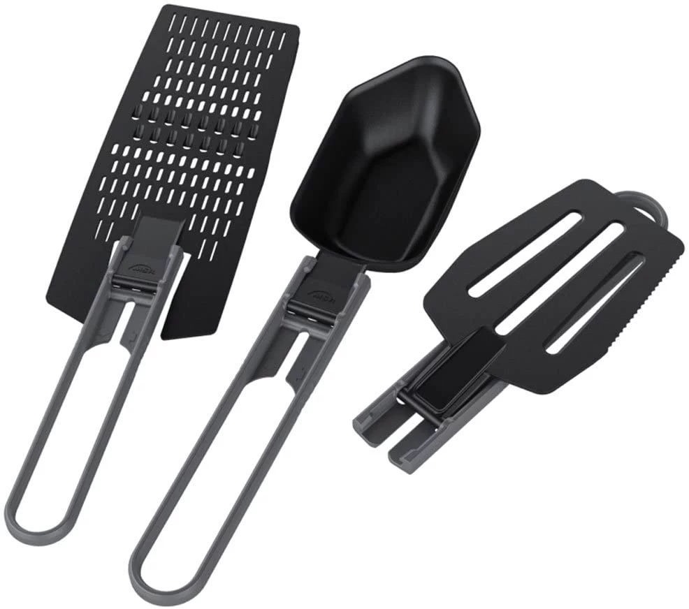 The Alpine Utensil Set from MSR gives you the meal-prep essentials. Built for fast and light trekking and backpacking trips, this handy camp kitchen kit features an Alpine Spatula with a serrated edge to cut soft meats and cheeses. The Alpine Spoon is calibrated for most commonly used measurements while the Alpine Grater/Strainer features a curved ridge that fits pot rims for efficient straining. The holes work as an excellent cheese grater. Utensils fold with a squeeze of the handle.