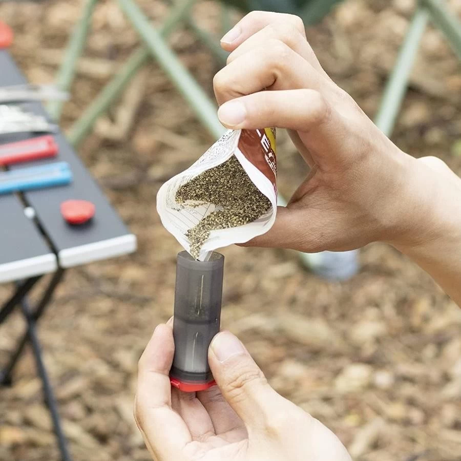 This handy camp kitchen kit features a folding spoon and spatula with a lightweight cutting board for food preparation. A salt and pepper shaker carries seasoning essentials while a squeeze bottle and dish towel let you take care of the dishes.