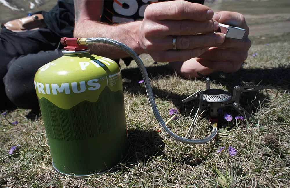 The low-weight design uses a blend of titanium, brass, and aluminium to deliver a compact cooking system with a high-strength gas tube connecting the fuel canister to the stove for side-by-side cooking. This keeps the unit lower to the ground for added stability and wind shielding in challenging conditions.